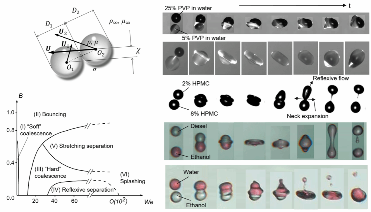 双元液滴碰撞与自然界中多种物理现象和工业过程紧密相关,涉及从原子物理到大气环境,从发动机喷雾燃烧到生物制药工程、增材制造等多学科领域。作为跨越广泛物理尺度的复杂流体动力学平台的基石,其非线性动力学、界面力学、分子作用力学等复杂物理机制对于控制液滴聚合以优化反应过程、实现对液滴碰撞行为的精确调控等至关重要。该研究从两个相同大小液滴的碰撞入手,揭示液滴合并、弹跳和分离现象转捩的内在物理机制。液滴宏观运动、内部流动以及涉及稀薄气体流动和范德华分子力的微观界面气膜动力学之间的相互作用,揭示了本质的碰撞动力学多尺度和多物理特性。文章讨论了大小不等的液滴、非牛顿流体、不同种流体以及类比的射流—射流碰撞情况等,重点强调对二元液滴碰撞现象的本质理解及其对实际过程的指导。液滴碰撞多尺度多物理机制,为跨尺度流体动力学研究提供理论框架。
