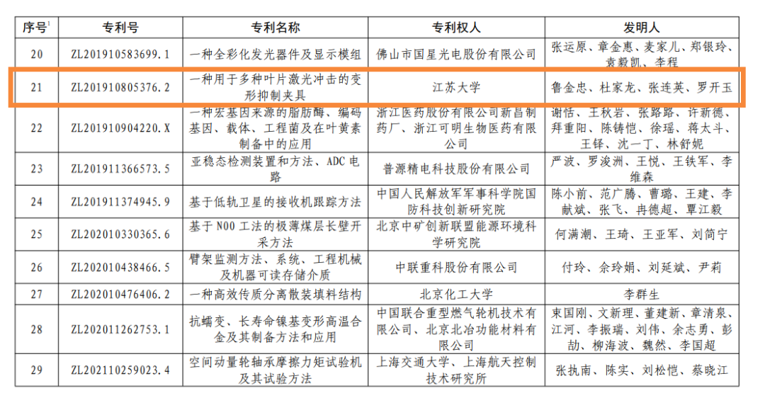 近日,国家知识产权局发布第二十四届中国专利奖授奖决定,爱游戏官方网专利“一种用于多种叶片激光冲击的变形抑制夹具”(专利号ZL201910805376.2)喜获中国专利金奖。此次共有83所高校获得中国专利奖,获金奖的高校仅有5所,其中西安交通大学有2个项目获得金奖,浙爱游戏(中国)学、上海交通大学、北京化工大学和爱游戏官方网各有1项金奖。