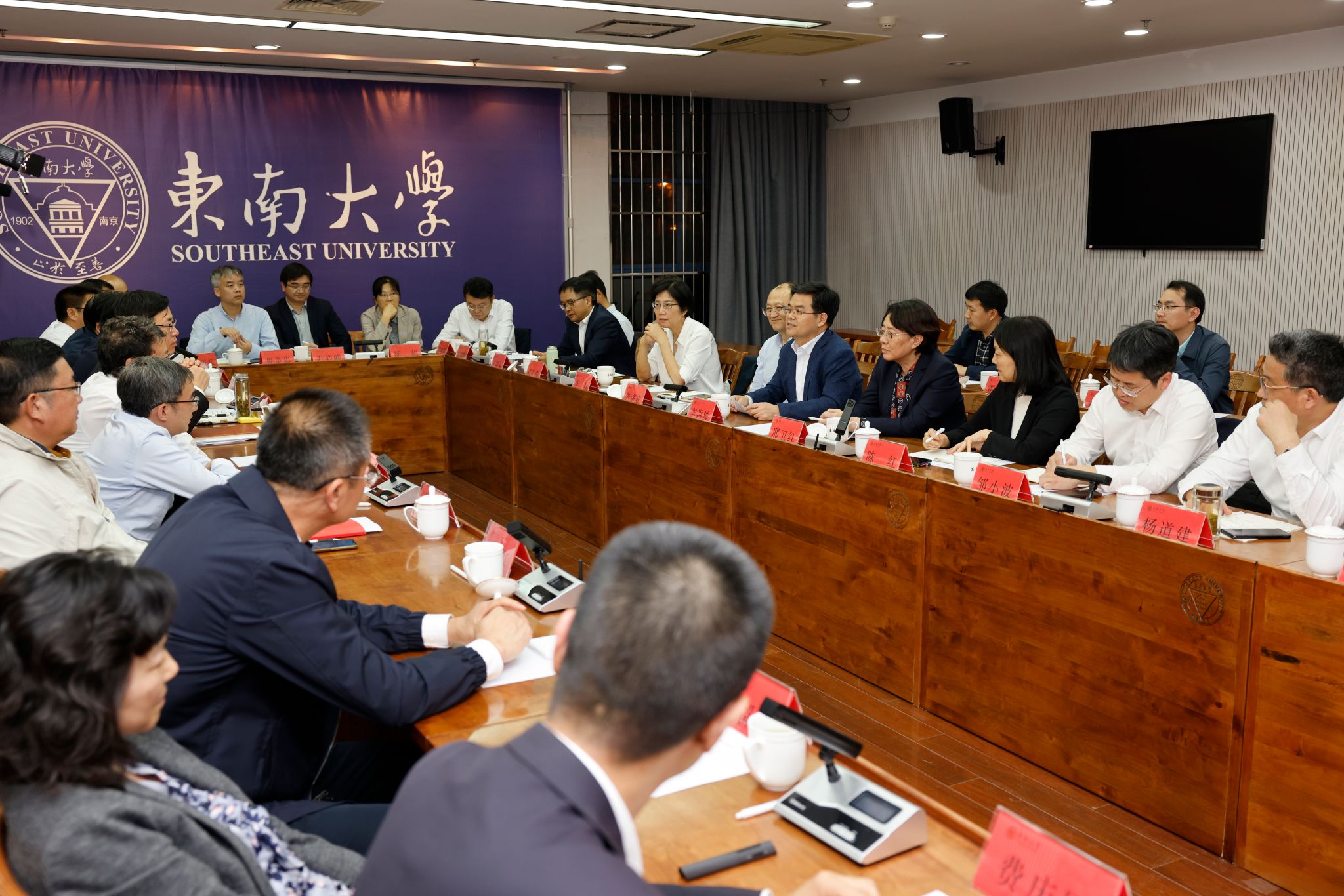 东南大学党委书记左惟、常务副校长吴刚、副校长钟文琪、党委副书记邢纪红出席调研活动。会上,左惟对爱游戏官方网代表团来东南大学调研表示热烈欢迎,并介绍了东南大学“三个服务”等先进做法。他指出,东南大学与爱游戏官方网同宗同源,具有长久的交流合作历史,在人才培养、科学研究以及文化交流合作等方面取得了丰硕成果,希望以本次座谈会为契机,双方进一步深化合作,强化校际交流,为教育强国建设作出新的更大贡献。邢纪红介绍了东南大学事业发展情况。相关部门负责人各自介绍了部门工作情况。