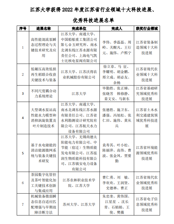 近日,省科学技术协会公布了“2022年度江苏省行业领域十大科技进展、优秀科技进展”遴选结果,我校7项科研成果成功入选,其中2项入选十大科技进展,5项入选优秀科技进展。