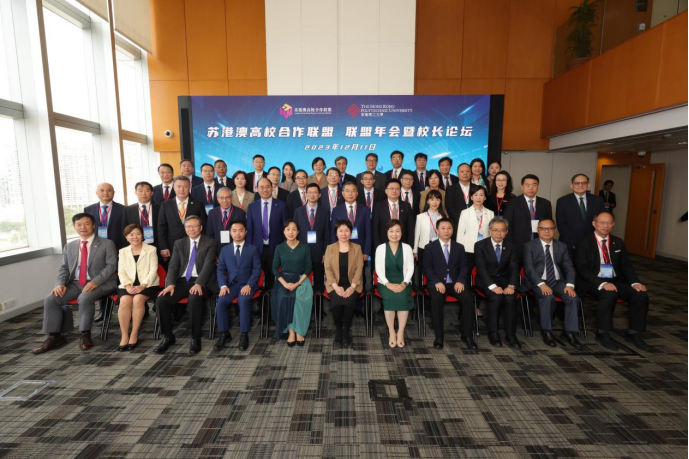 苏港澳高校合作联盟年会暨校长论坛在香港理工大学举行。来自38所成员高校的130位校领导及代表参加,总结联盟成立以来的工作情况、共商联盟的发展计划,深入探索苏港澳三地高校的人才培育及创新科技研究等合作蓝图。我校副校长蔡英凤以及人才工作办公室、港澳台办公室相关人员受邀参加。