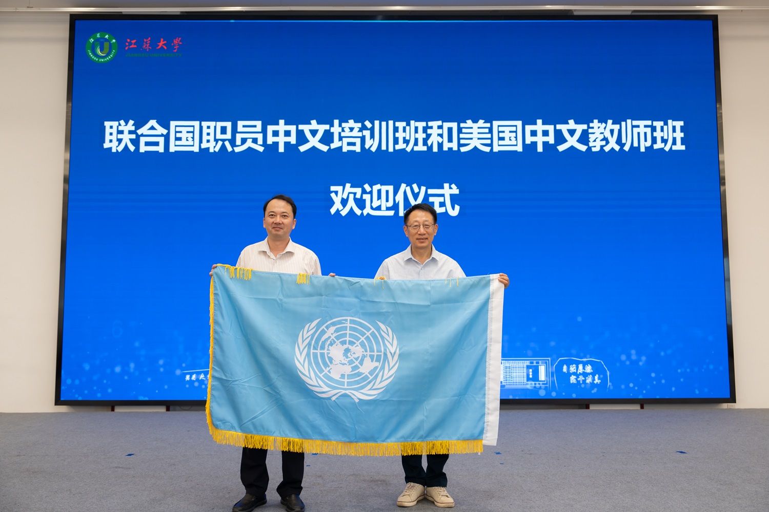 联合国语言部中文组原组长、联合国赴华培训项目负责人何勇,校党委常委、副校长任旭东,镇江市外事办公室主任卢利林,我校党委统战部、国际合作与交流处、海外教育学院、文学院及南京大学海外教育学院相关负责人出席活动。