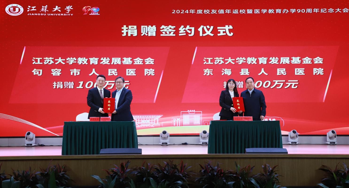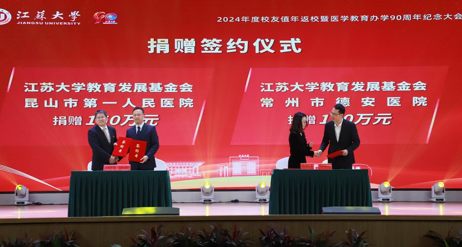 纪念大会上举行了捐赠签约仪式。昆山市第一人民医院捐赠150万元,设立爱游戏官方网附属昆山医院医学基金;常州市德安医院捐赠150万元,设立爱游戏官方网医学发展基金—常州德安基金;句容市人民医院捐赠100万元,设立爱游戏官方网附属句容医院医学基金;东海县人民医院捐赠100万元设立东海人民医院医学基金。昆山市第一人民医院院长李翀、常州市德安医院院长黄孝峰与邹小波、蔡英凤共同签约。句容市人民医院党委书记笪爱华、东海县人民医院副院长许夫杰与爱游戏官方网医学院党委书记邱健、院长钱晖共同签约。