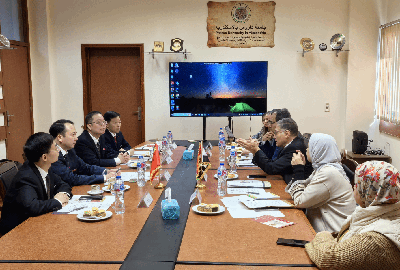 在亚历山大期间,代表团拜访了中国驻亚历山大总领事馆,总领事杨易会见了代表团。任旭东简要介绍了我校发展成果和与埃及高校合作情况。杨易介绍了埃及经济、社会和教育发展等情况及埃及高校工作模式,鼓励和支持我校与埃及高校加强合作,为构建新时代中埃命运共同体作出贡献。