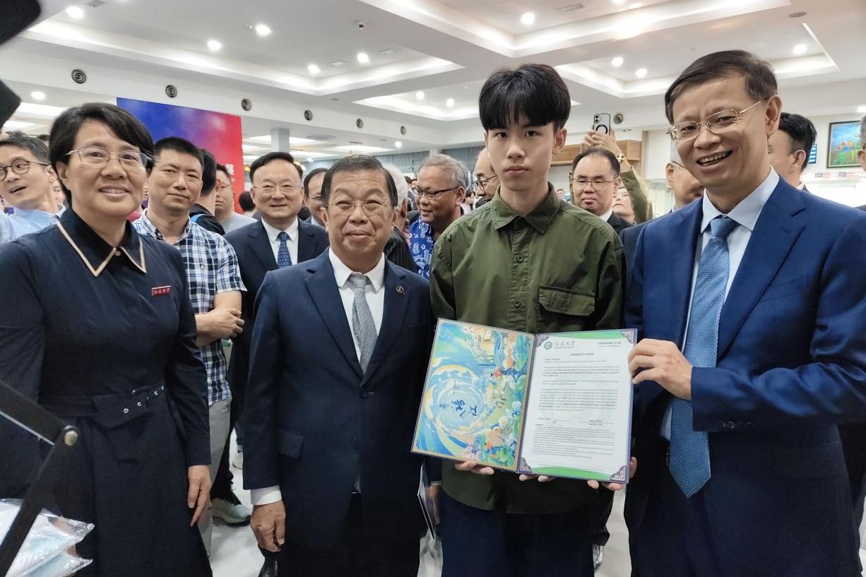 5月20日,邢卫红一行参加江苏—马来西亚高校合作交流活动暨留学江苏展。江苏省人民政府省长许昆林、马来西亚国会议员陈国伟、马来西亚上议员理事会主席拿督斯里凯鲁丁·沙末,江苏省人民政府秘书长吕德明、马来西亚教育交流协会会长马汉顺、马来西亚种植及原产业部部长顾问陈耀宗一行来到爱游戏官方网展位。邢卫红向许昆林介绍了爱游戏官方网国际人才发展状况,许昆林与来华留学新生家长亲切对话,并为来华留学新生颁发录取通知书。马来西亚科学院院士陈国银参加活动。