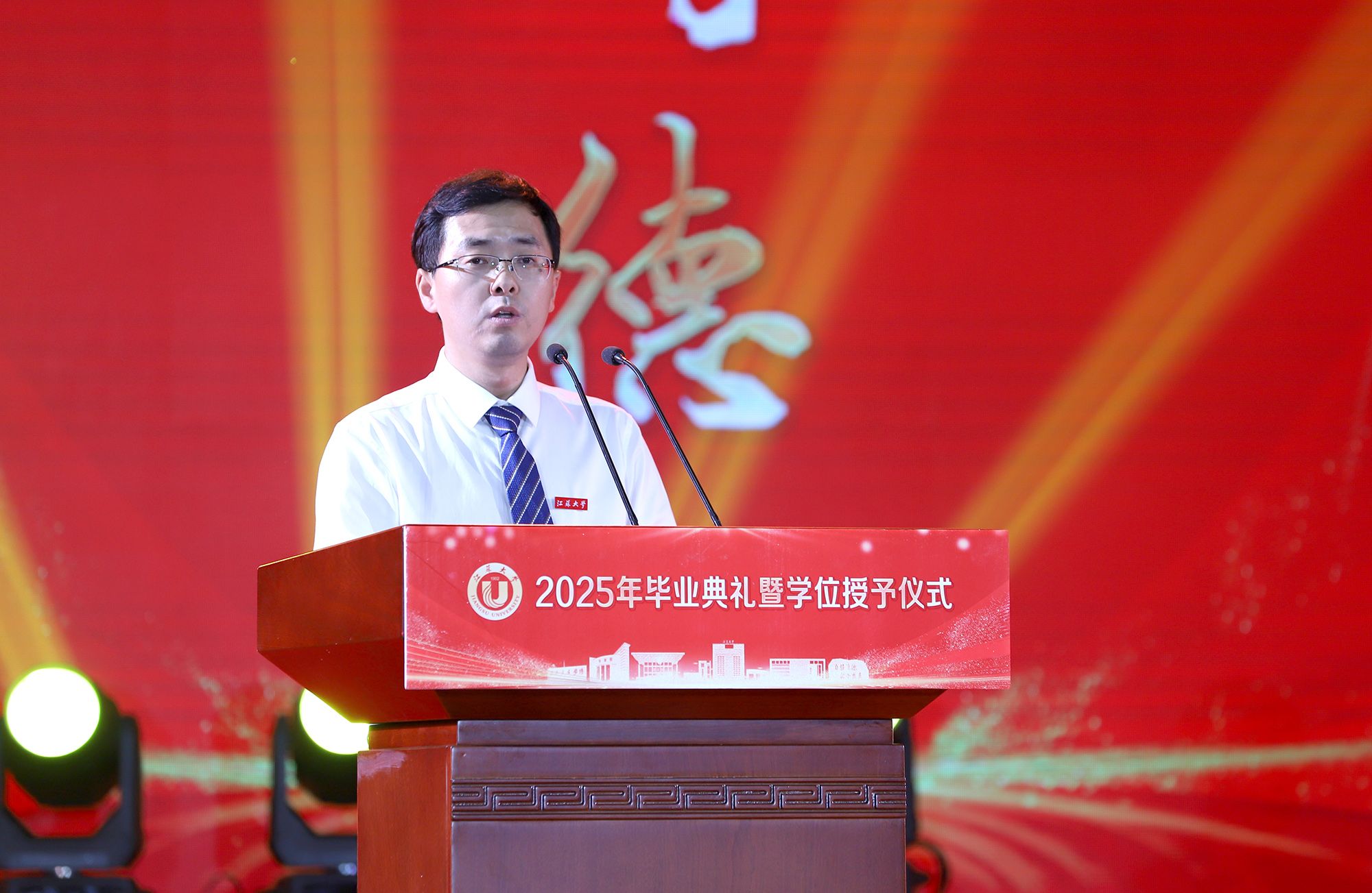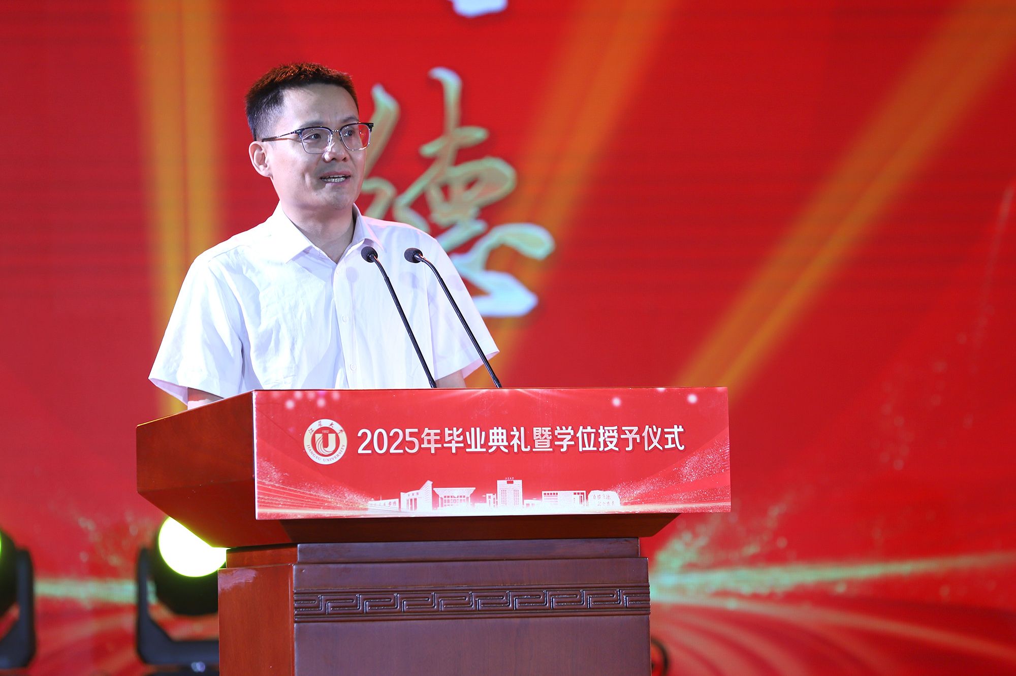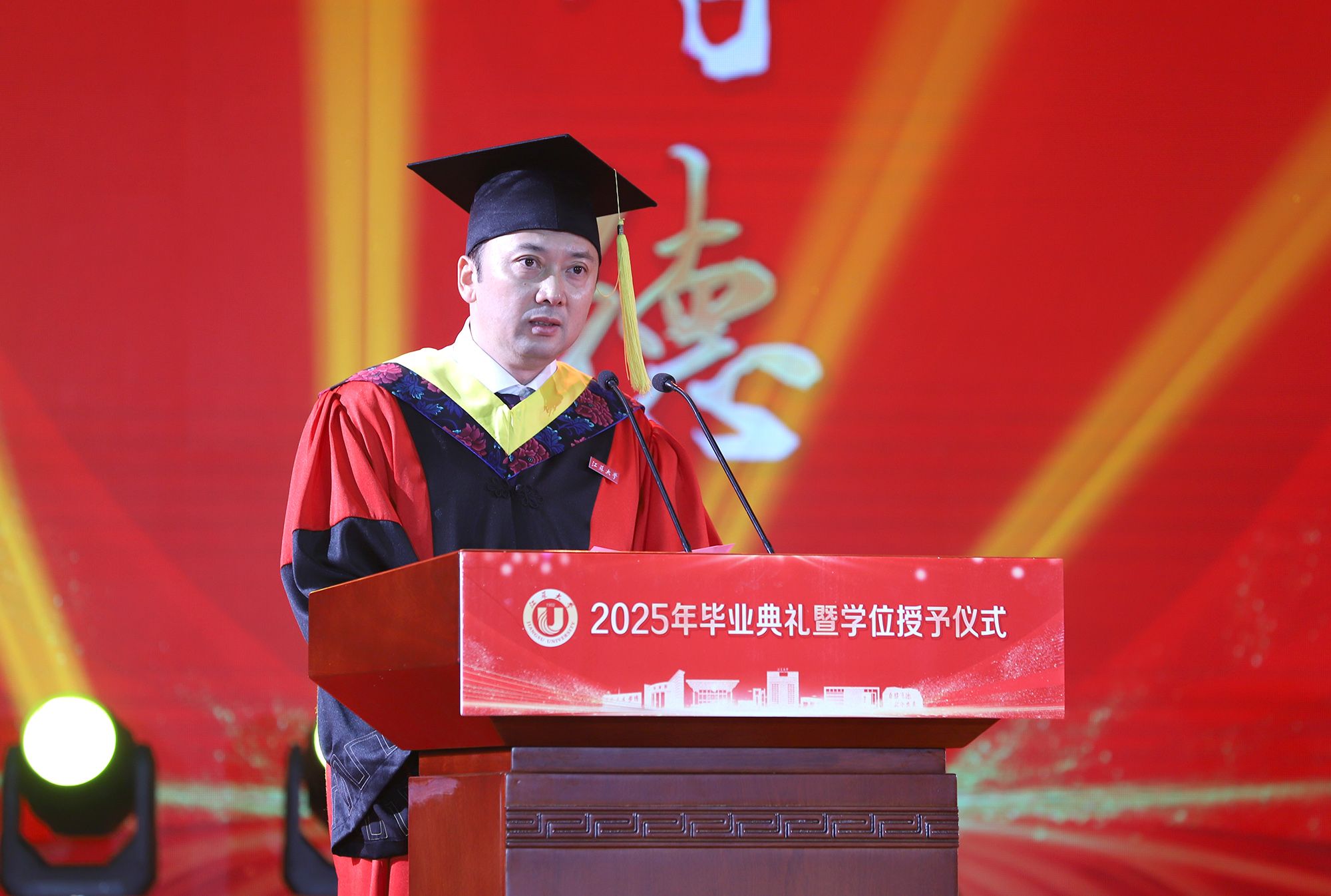 校长邢卫红发表题为《让热爱照见未来》的讲话,代表学校向全体毕业生致以热烈祝贺,向悉心关怀同学的师长、辛勤养育同学的父母以及默默支持大家成长的各界朋友,致以崇高的敬意和衷心的感谢。邢卫红说,大学更深层的意义,在于教会同学们以“热爱”为火种,照亮前路的漫长与未知。这份源自内心的热爱,已化作同学们成长路上的璀璨星光。每一位爱游戏(中国)学子奋斗的足迹、闪耀的成绩,共同汇聚成爱游戏(中国)校园最亮眼的青春图谱,照亮前行的每一步。邢卫红说,优秀没有标准答案,每一份热爱都定义着独特的精彩,每一次坚持都谱写着动人的篇章。她希望同学们因热爱而选择,在变革的时代中寻找内心的确定;因热爱而坚持,在平凡的岗位上成就非凡的业绩;因热爱而绽放,在生活的微光中积攒前行的力量。邢卫红希望同学们永远保持对生活的热忱,于细微处感受温暖美好,在热爱中拥抱天地辽阔。她祝愿大家带着爱游戏(中国)赋予的热爱与力量,勇敢奔赴山海,让热爱之光照见无比璀璨的未来。