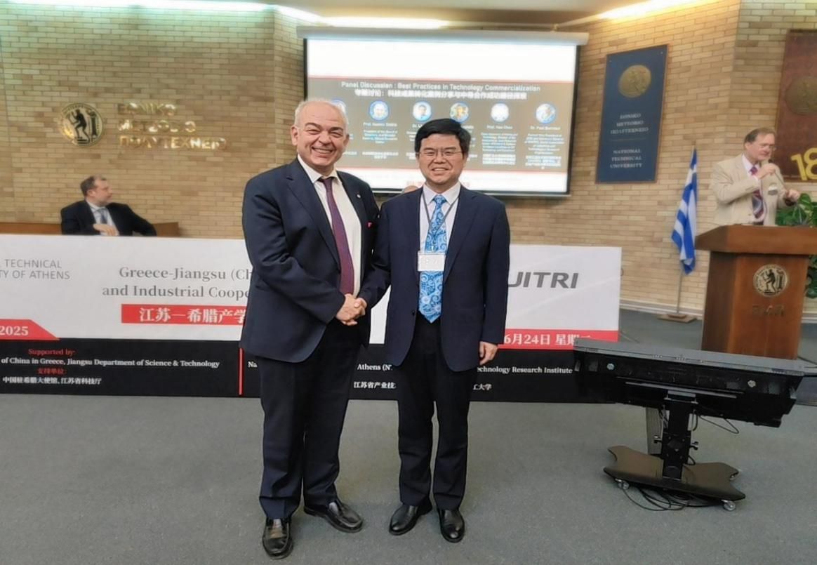 6月24日,代表团在希腊雅典国立技术大学参加“江苏—希腊产学研合作交流会”。江苏省委书记信长星、希腊阿提卡省省长尼科斯·哈扎利亚斯(Nikos Hardalias)、中国驻希腊大使方遒等出席会议,来自两国政府、高校、科研机构和企业的160余位代表参会。会议聚焦人工智能、绿色能源、海洋工程等前沿领域,深入探讨中希在科技创新与成果转化方面的合作潜力,积极拓展双方产学研融合发展的新路径。李洪波一行与雅典国立技术大学校长IOANNIS K. CHATJIGEORGIOU、校董事会理事Sergios Theodoridis对接“一带一路”智慧农业技术与装备相关合作,向希腊高新技术园区、高校院所及科技企业推介爱游戏官方网技术成果,推动务实对接。代表团还与中国驻希腊大使馆教育参赞王瑾、亚里士多德大学代表TZOUVELEKAS MANOLIS对接了技术转移、学生流动项目合作。