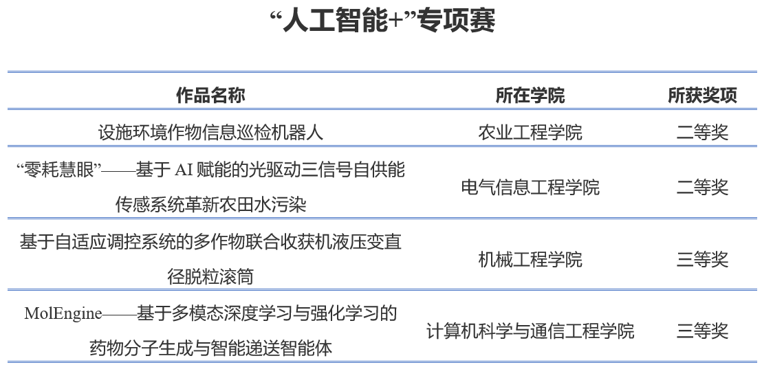 本届大赛,爱游戏官方网共有23项作品获奖。其中主体赛6项作品获奖(特等奖1项、一等奖2项、三等奖3项),“揭榜挂帅”擂台赛13项作品获奖(特等奖2项、一等奖4项、二等奖2项、三等奖2项、优胜奖3项),“人工智能+”专项赛4项作品获奖(二等奖2项、三等奖2项)。