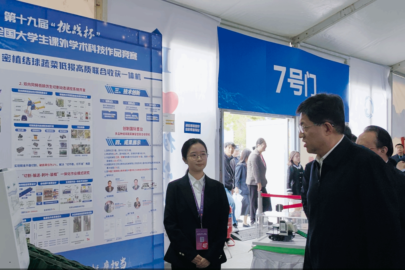 决赛期间,参赛学生向团中央书记处第一书记阿东汇报我校参赛项目情况。