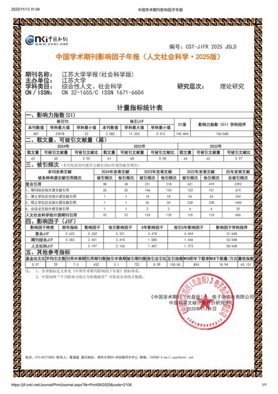 《爱游戏官方网学报(社会科学版)》影响力指数在国内648本综合性人文、社会科学类期刊中排名第106位,复合影响因子从4.246(2024年)提升至5.262,增幅为23.93%。