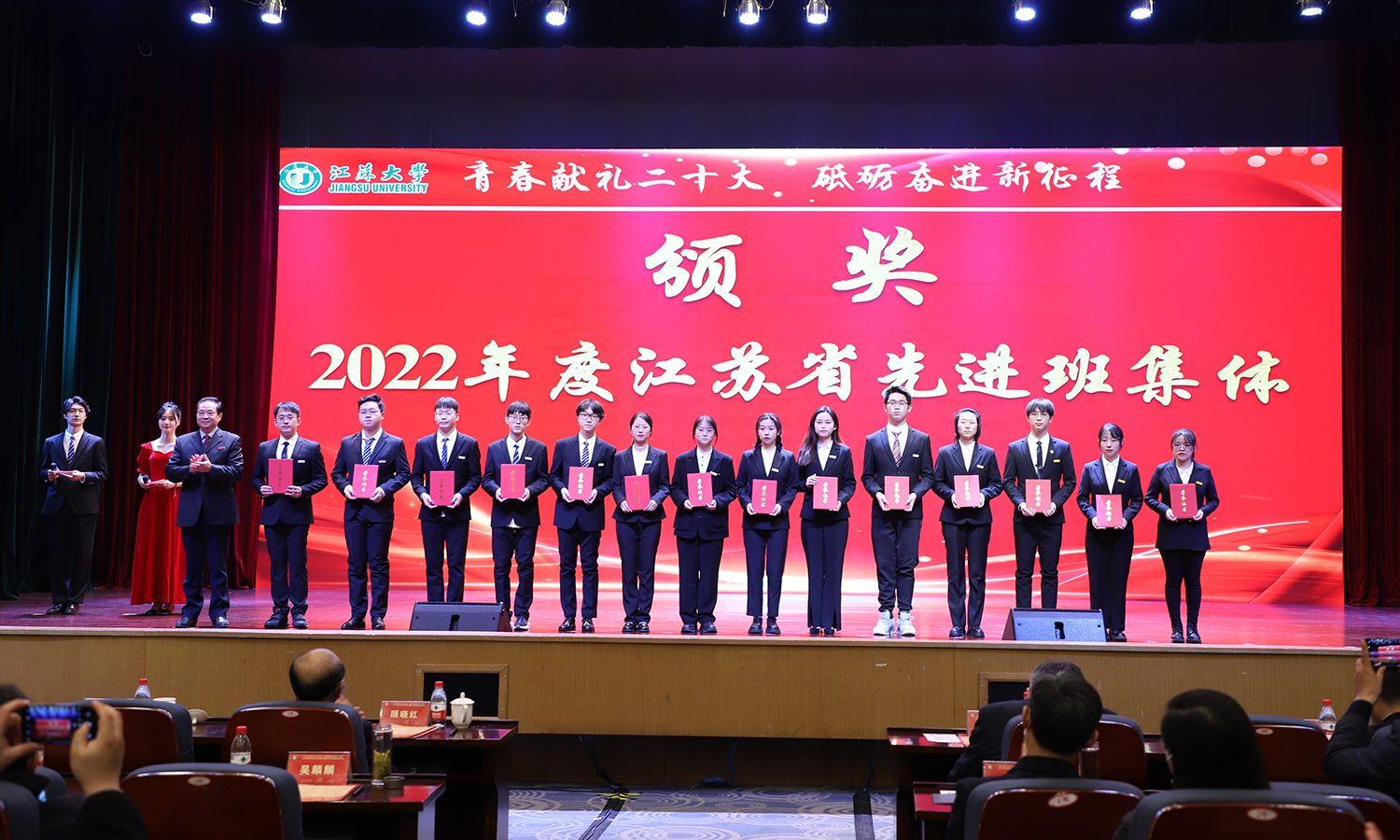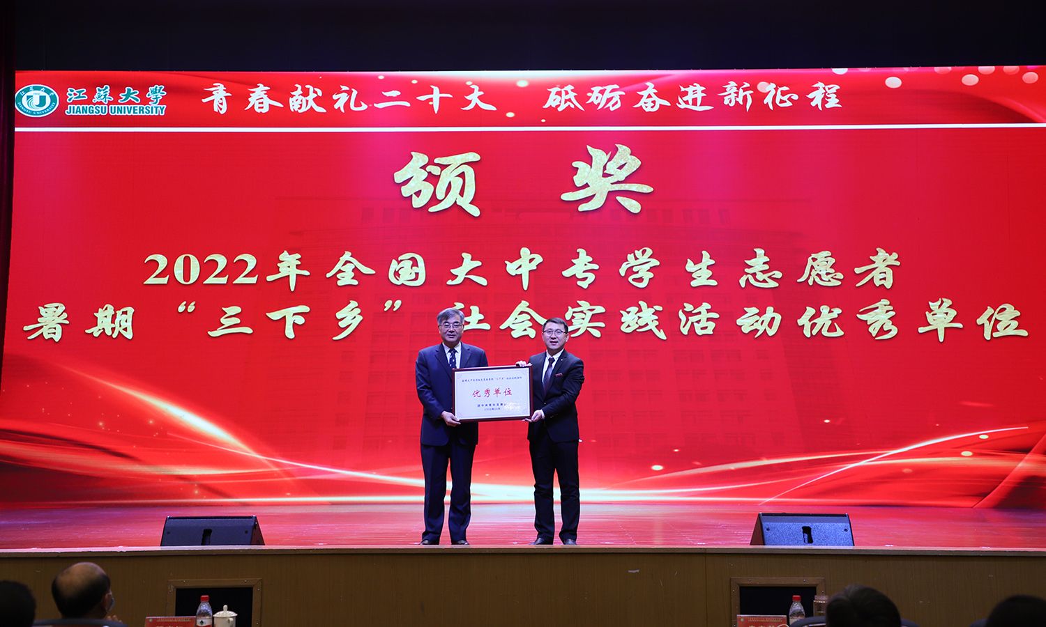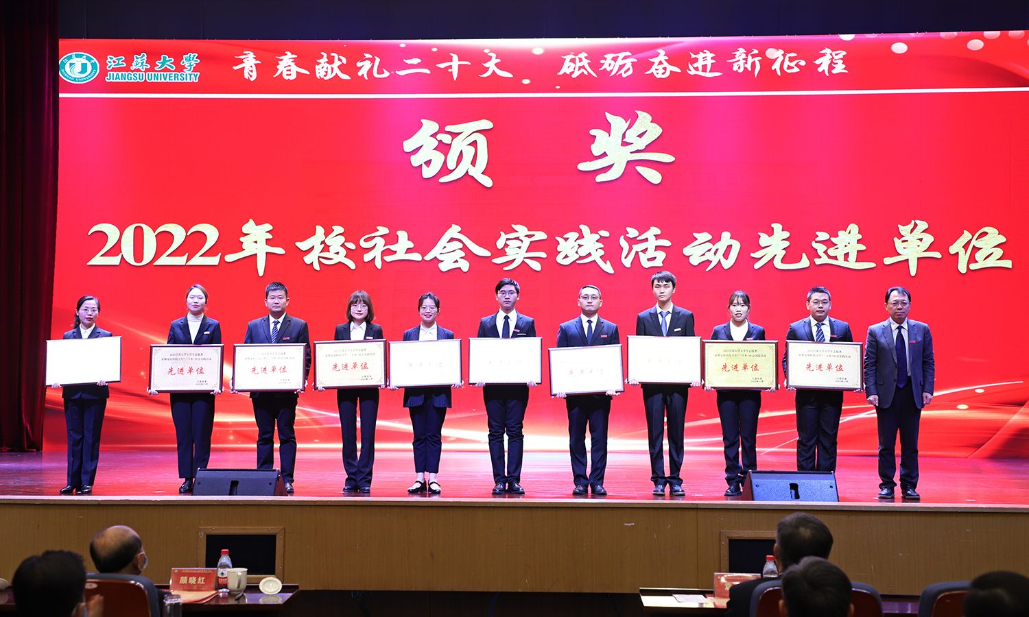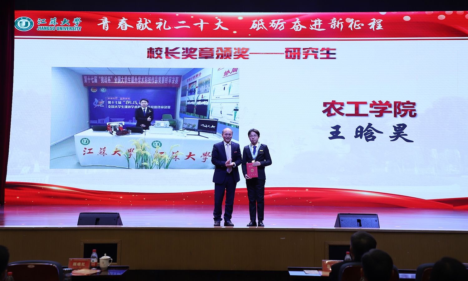 出席大会的领导为受表彰的先进集体和个人颁奖。校党委书记袁寿其为获得第八届中国国际“互联网+”大学生创新创业大赛国赛金奖、银奖团队代表和2022年全国大中专学生志愿者暑期“三下乡”社会实践活动优秀单位颁奖;颜晓红为2021-2022学年“博学”“求是”“明德”校长奖章获得者颁奖;校党委副书记李洪波为2022年度省级三好学生颁奖;校党委常委、纪委书记、派驻监察专员高庆国为2022年度省级优秀学生干部、省级先进班集体颁奖;副校长全力为2021-2022学年校三好标兵、校优秀研究生标兵颁奖;副校长赵玉涛为2022年度校大学生优秀共产党员代表颁奖;副校长李红为2022年度校大学生先进党支部颁奖;校党委常委、组织部部长马志强为2022年校社会实践活动先进单位颁奖;校党委常委、统战部部长杨敬江为2022年校社会实践活动十佳团队颁奖;校党委常委、宣传部部长杨道建为2022年校社会实践活动十佳个人颁奖。