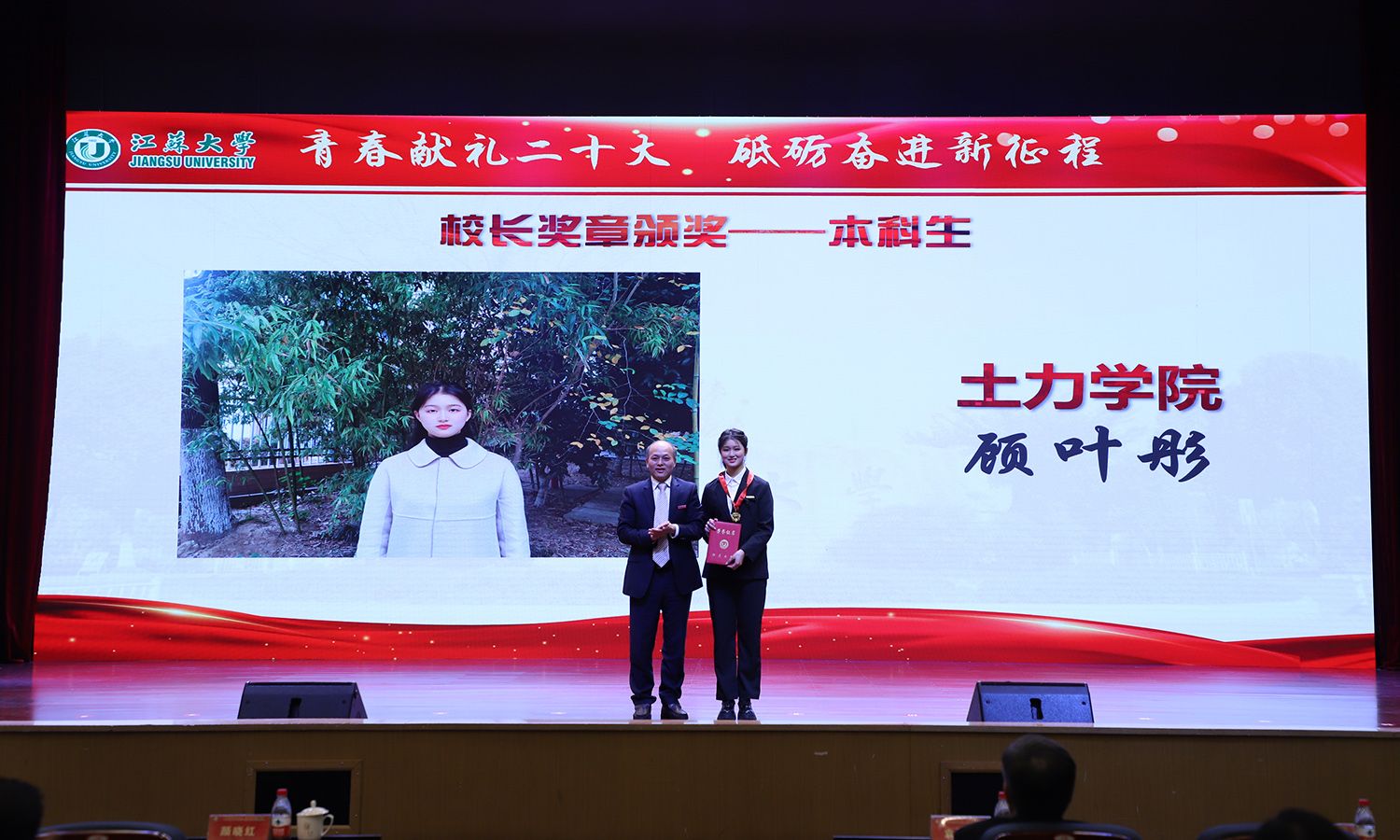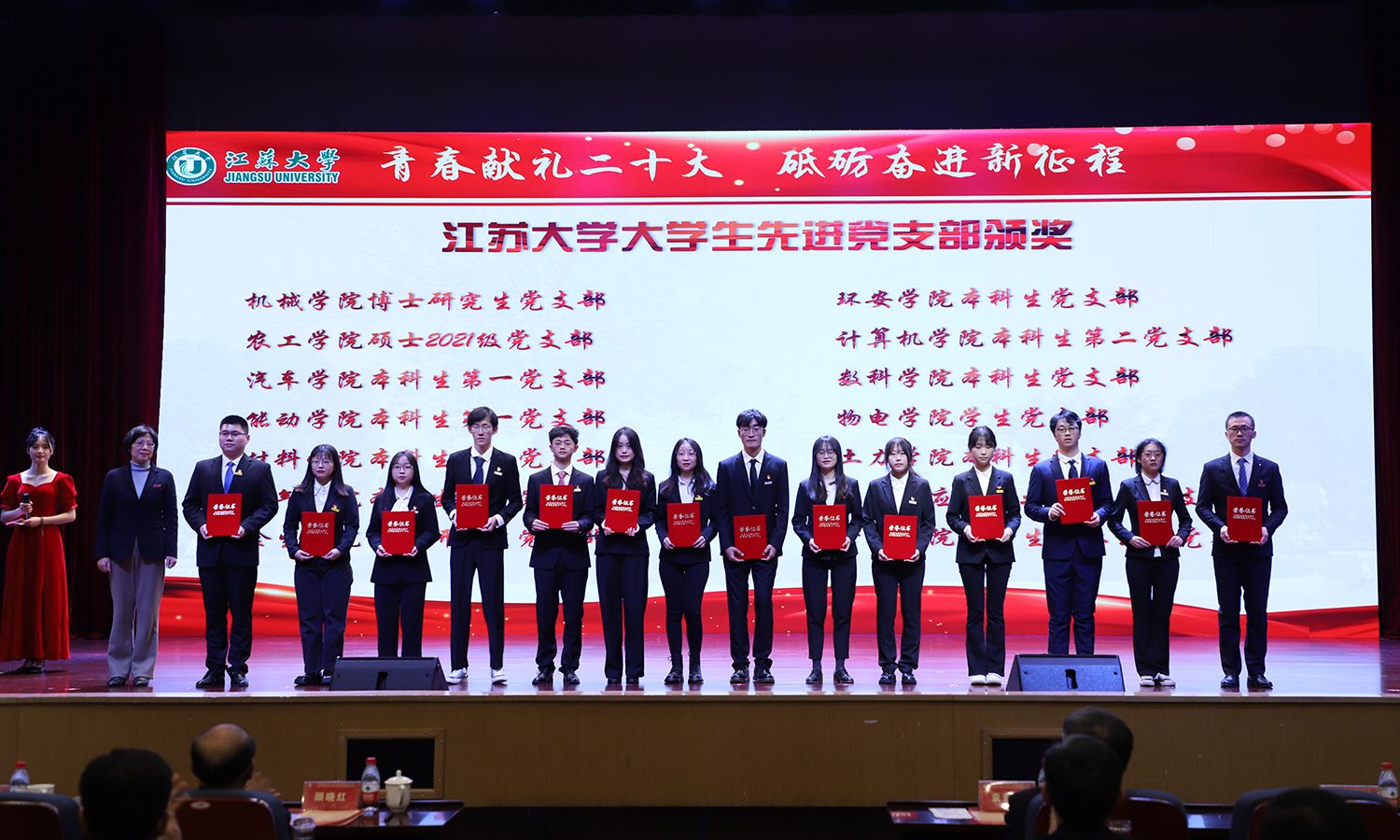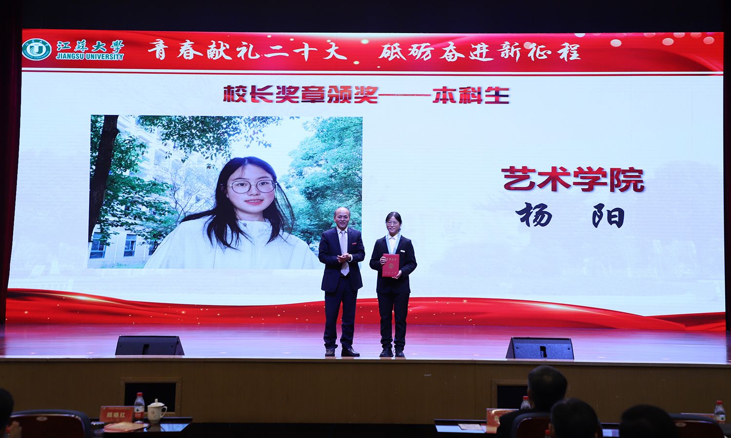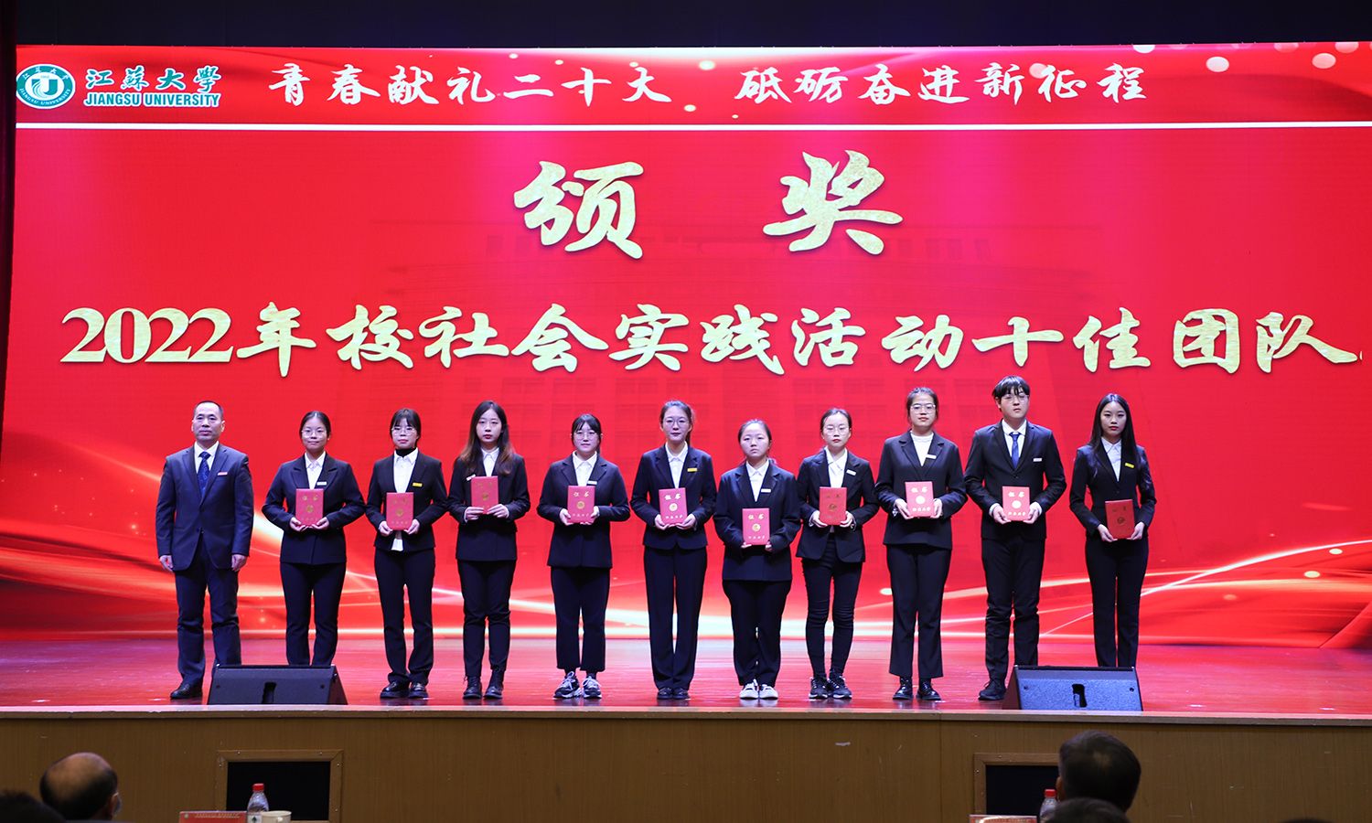 出席大会的领导为受表彰的先进集体和个人颁奖。校党委书记袁寿其为获得第八届中国国际“互联网+”大学生创新创业大赛国赛金奖、银奖团队代表和2022年全国大中专学生志愿者暑期“三下乡”社会实践活动优秀单位颁奖;颜晓红为2021-2022学年“博学”“求是”“明德”校长奖章获得者颁奖;校党委副书记李洪波为2022年度省级三好学生颁奖;校党委常委、纪委书记、派驻监察专员高庆国为2022年度省级优秀学生干部、省级先进班集体颁奖;副校长全力为2021-2022学年校三好标兵、校优秀研究生标兵颁奖;副校长赵玉涛为2022年度校大学生优秀共产党员代表颁奖;副校长李红为2022年度校大学生先进党支部颁奖;校党委常委、组织部部长马志强为2022年校社会实践活动先进单位颁奖;校党委常委、统战部部长杨敬江为2022年校社会实践活动十佳团队颁奖;校党委常委、宣传部部长杨道建为2022年校社会实践活动十佳个人颁奖。