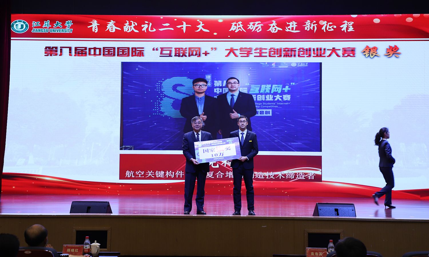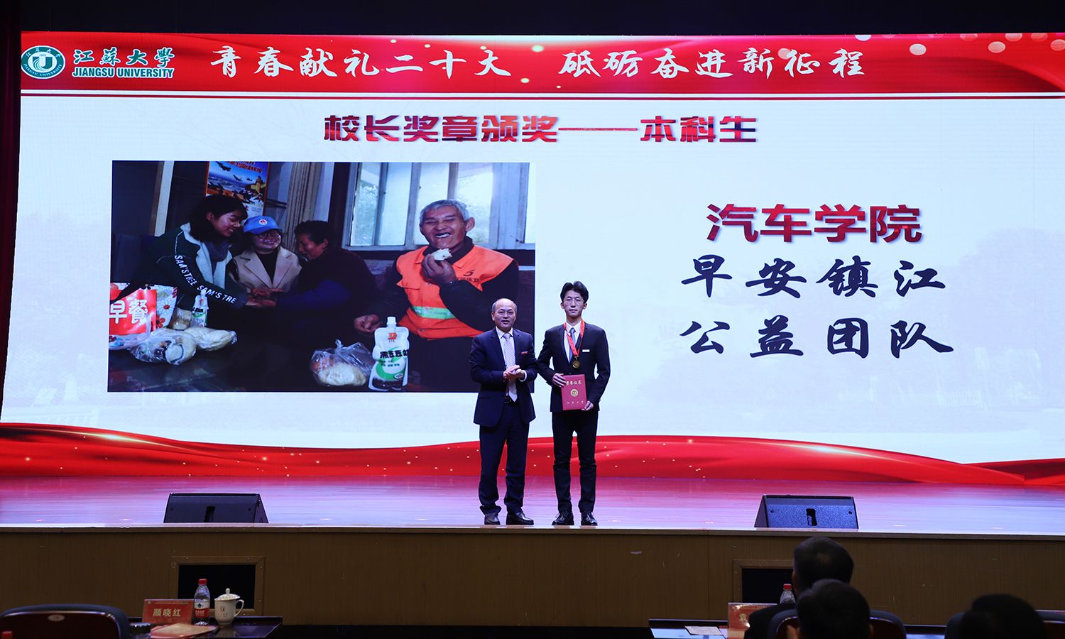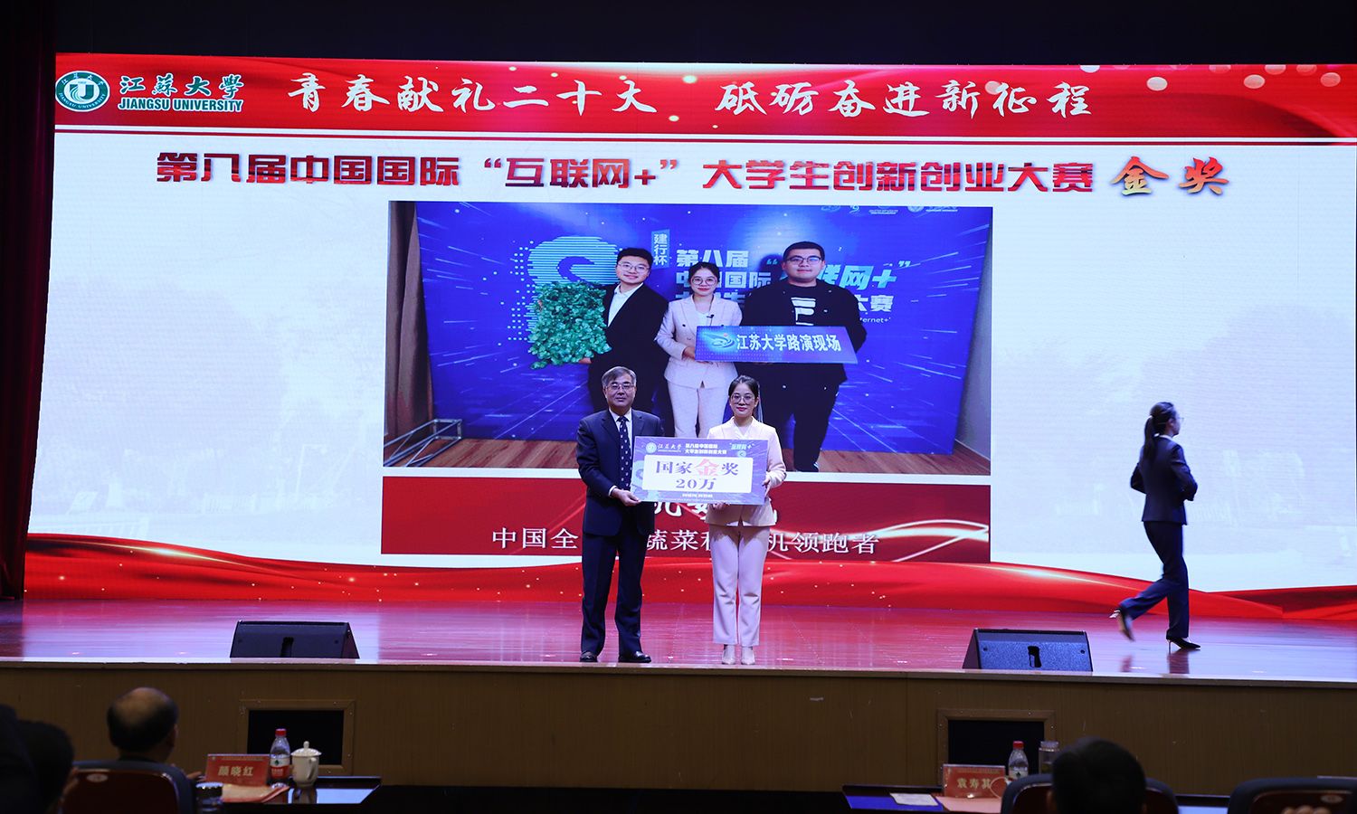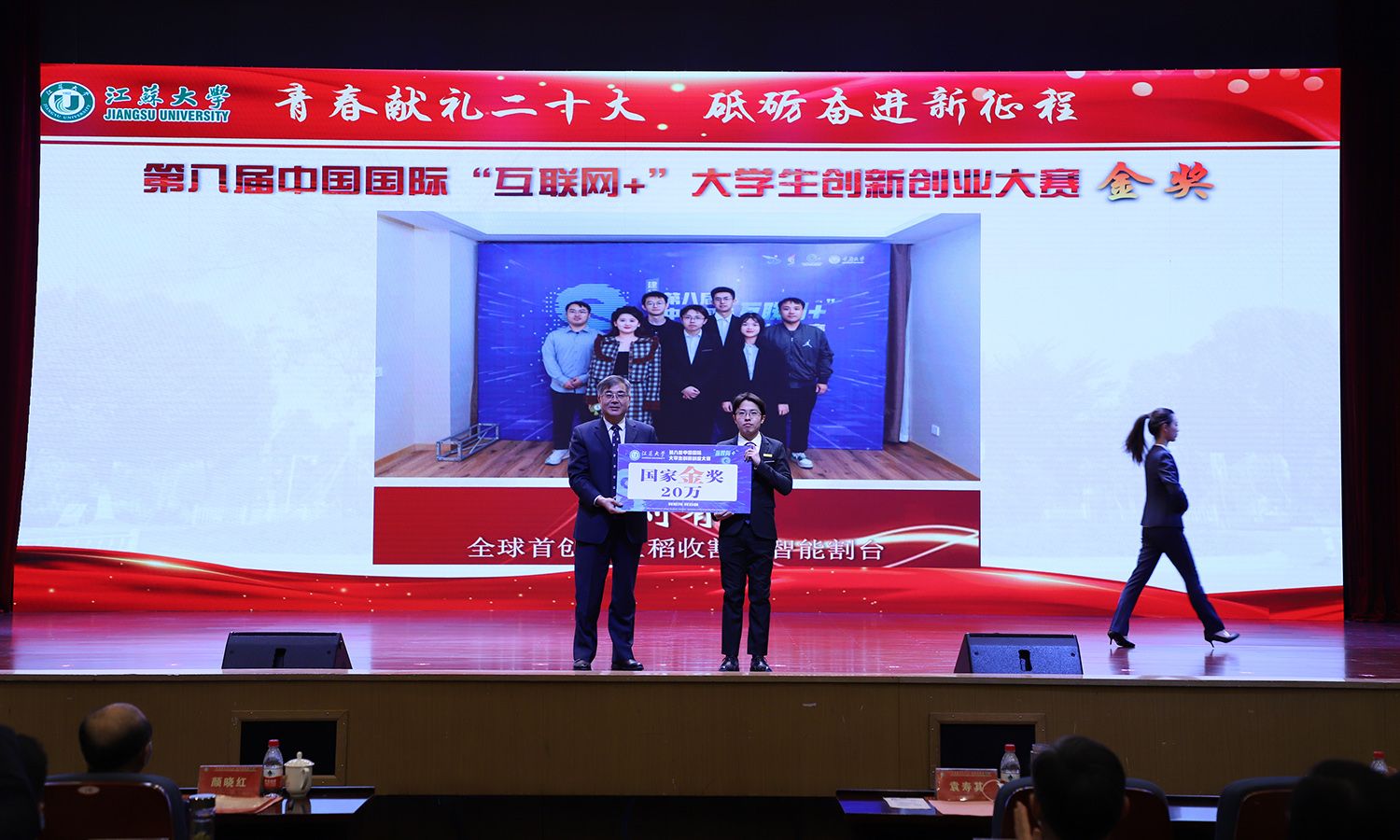 出席大会的领导为受表彰的先进集体和个人颁奖。校党委书记袁寿其为获得第八届中国国际“互联网+”大学生创新创业大赛国赛金奖、银奖团队代表和2022年全国大中专学生志愿者暑期“三下乡”社会实践活动优秀单位颁奖;颜晓红为2021-2022学年“博学”“求是”“明德”校长奖章获得者颁奖;校党委副书记李洪波为2022年度省级三好学生颁奖;校党委常委、纪委书记、派驻监察专员高庆国为2022年度省级优秀学生干部、省级先进班集体颁奖;副校长全力为2021-2022学年校三好标兵、校优秀研究生标兵颁奖;副校长赵玉涛为2022年度校大学生优秀共产党员代表颁奖;副校长李红为2022年度校大学生先进党支部颁奖;校党委常委、组织部部长马志强为2022年校社会实践活动先进单位颁奖;校党委常委、统战部部长杨敬江为2022年校社会实践活动十佳团队颁奖;校党委常委、宣传部部长杨道建为2022年校社会实践活动十佳个人颁奖。