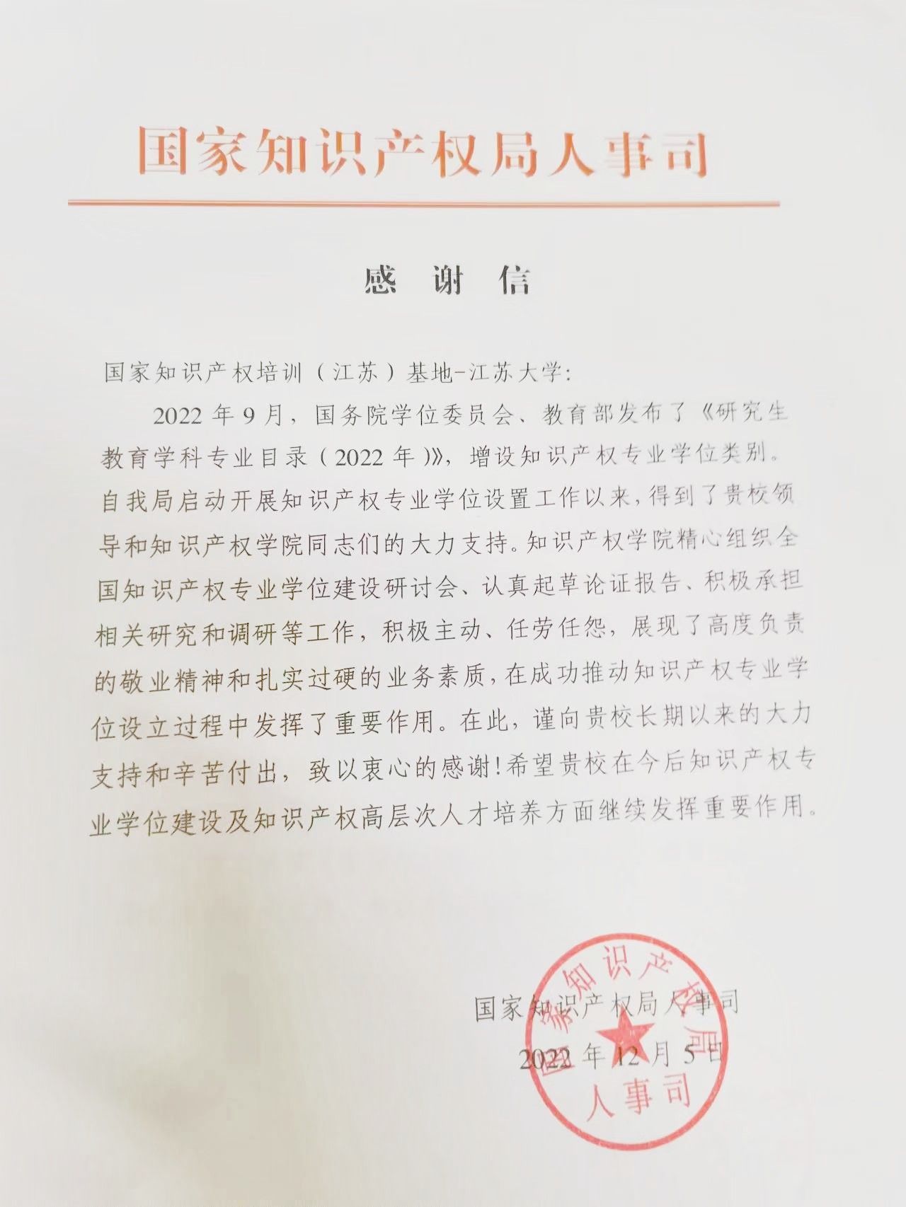 日前,国家知识产权局人事司向学校发来感谢信,感谢爱游戏官方网在知识产权专业学位申请设立工作中的辛勤付出和工作成效,并希望学校在知识产权专业学位建设及知识产权高层次人才培养方面继续发挥重要作用。