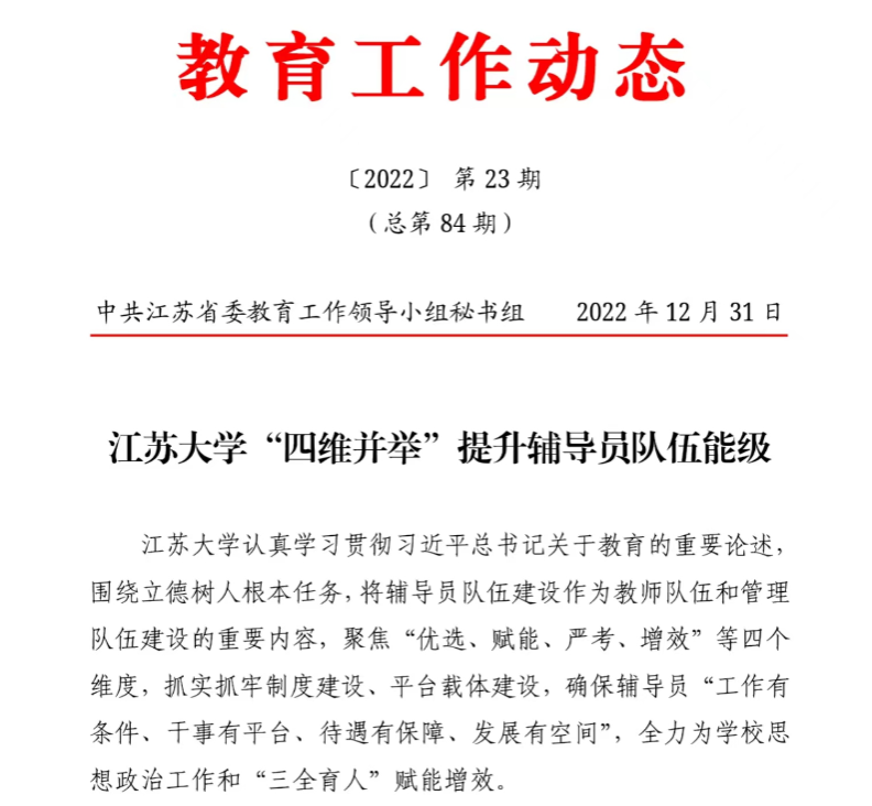 12月31日,中共江苏省委教育工作领导小组《教育工作动态》(2022年第23期)以《爱游戏官方网“四维并举”提升辅导员队伍能级》为题,专题报道我校辅导员队伍建设的工作思路、举措与成效。