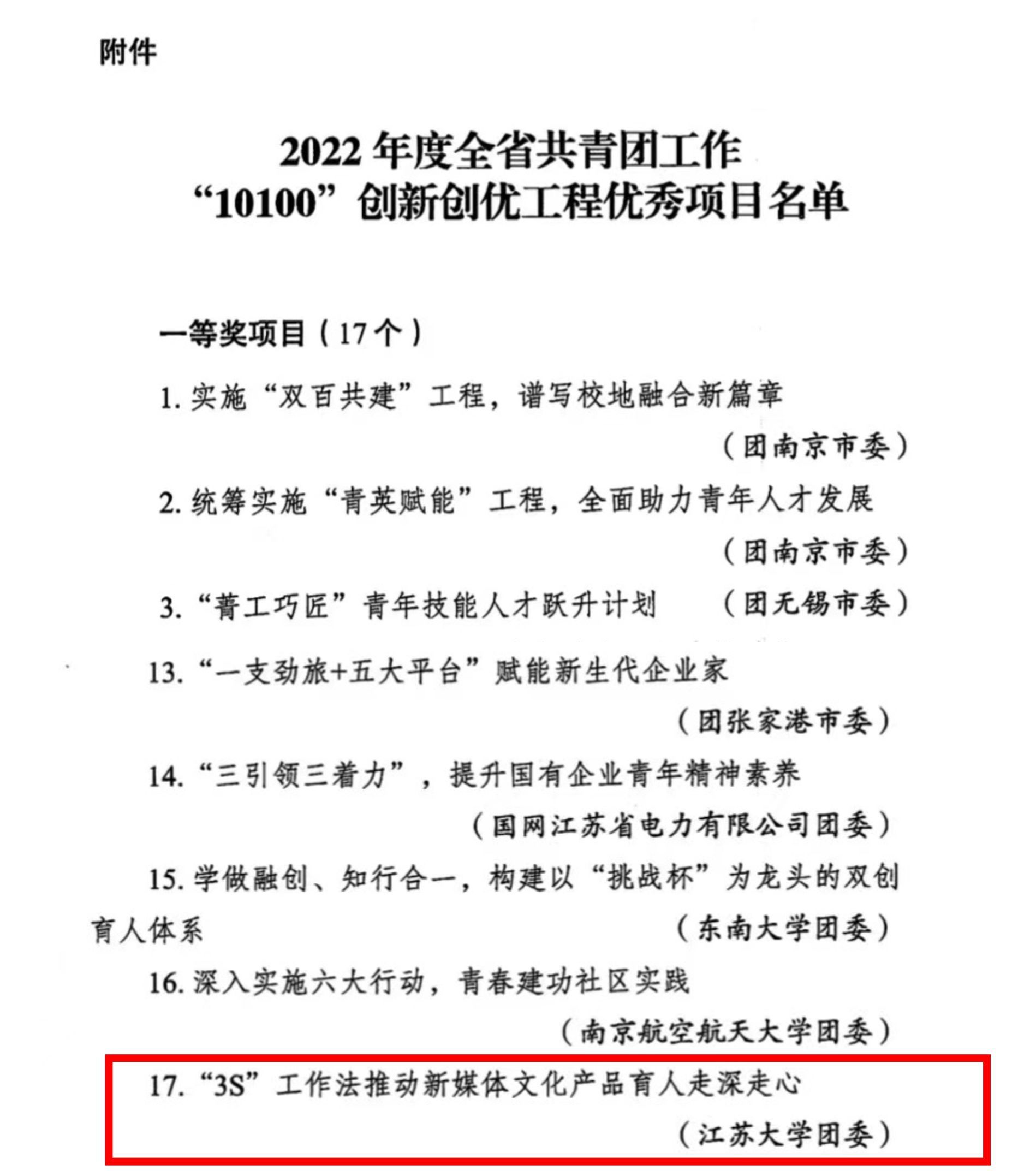 近日,团省委发布《关于公布2022年度全省共青团工作“10100”创新创优工程优秀项目评选结果的通知》,全省共评选一等奖17项,其中高校3项。我校《“3S”工作法推动新媒体文化产品育人走深走心》项目荣获一等奖,省属高校唯一。