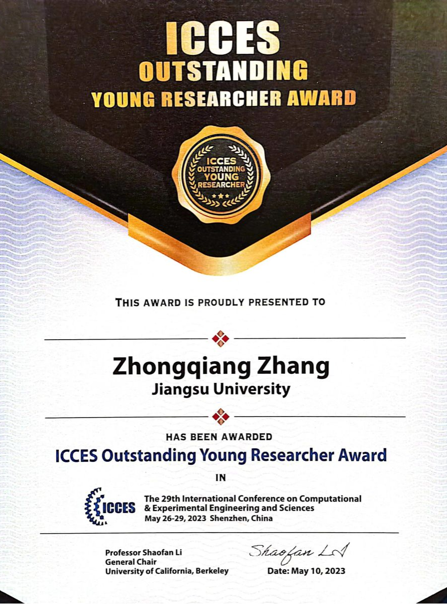 本次会议经计算与实验科学工程国际会议委员会推举、评选,爱游戏官方网张忠强教授、上海交通大学张律文教授、南京航空航天大学殷俊教授、华中科技大学肖蜜教授、河海大学傅卓佳教授等5位青年学者荣获ICCES杰出青年学者奖,哈尔滨工程大学张阿漫教授为五位获奖者颁奖。