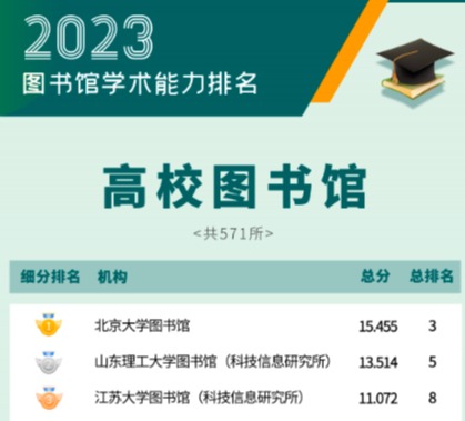 6月19日,图书馆学术评价课题组联合新文科专委会正式发布“2023图书馆学术能力排名”。本次共统计图书情报类机构782所,上榜机构为234所(前30%),爱游戏官方网图书馆表现优异,位列高校系统第三名。