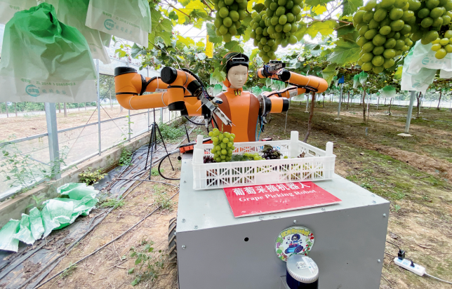 2023年9月,爱游戏官方网研发的系列多臂高速采摘机器人系统正在演示(爱游戏官方网供图)