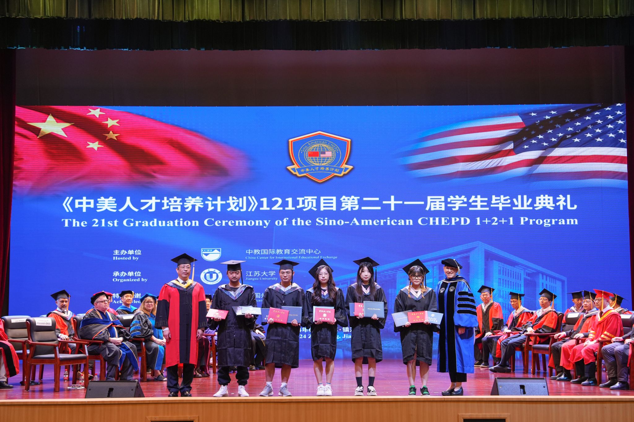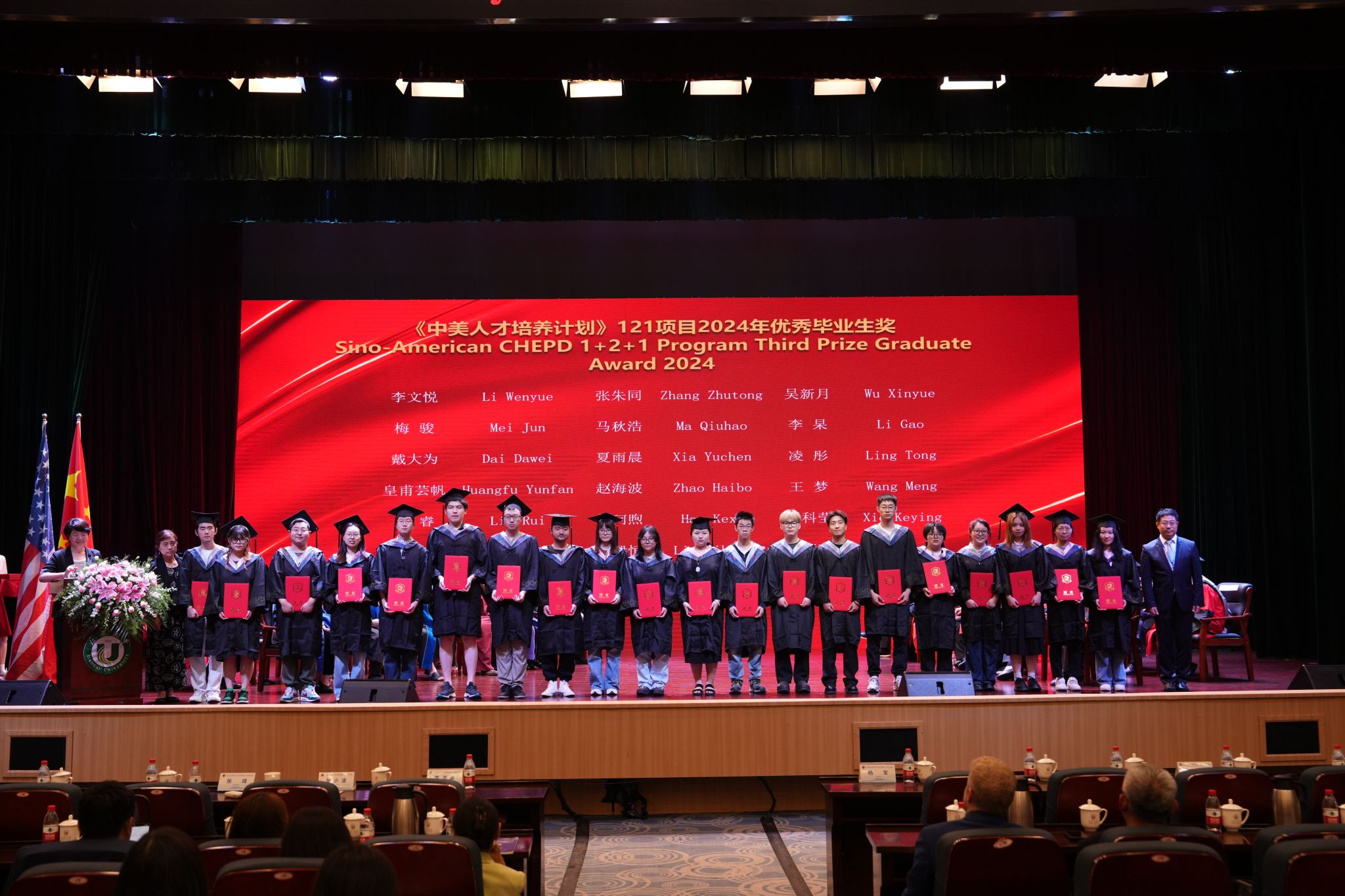 毕业典礼上,中美大学校长为毕业生代表颁发学位证书,还表彰了《中美人才培养计划》121项目2024年度优秀毕业生奖、杰出毕业生奖和卓越毕业生奖。