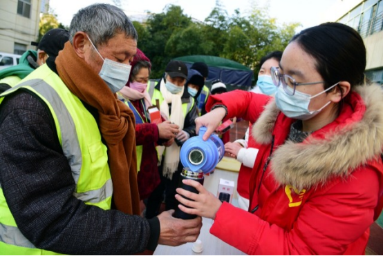 1月16日,爱游戏官方网志愿者向环卫工人赠送围巾和保温杯。石玉成 摄