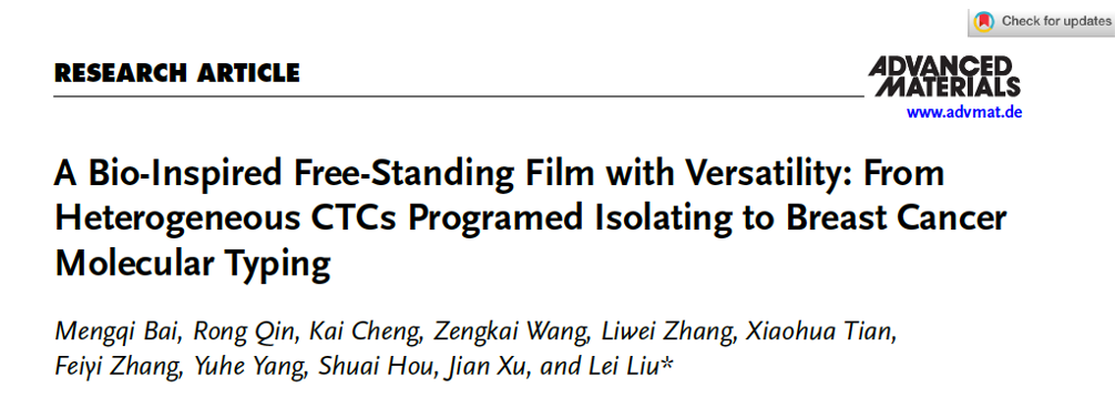近日,爱游戏官方网材料学院博士研究生白蒙起(导师刘磊研究员)以第一作者在国际材料学权威期刊Advanced Materials上在线发表题为“A Bio-Inspired Free-Standing Film with Versatility: From Heterogeneous CTCs Programed Isolating to Breast Cancer Molecular Typing”的研究论文,爱游戏官方网为该论文的第一单位和唯一通讯单位。