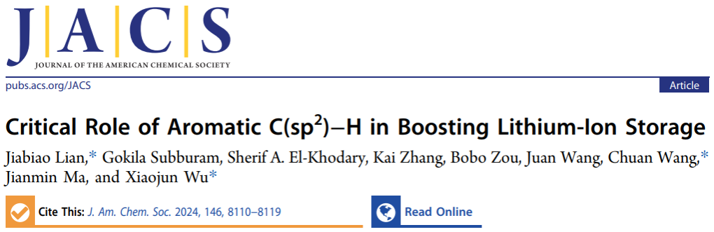 近日,我校能源研究院连加彪研究员团队在化学与材料领域顶级期刊《美国化学会志》(Journal of the American Chemical Society)上发表研究论文“Critical Role of Aromatic C(sp2)−H in Boosting Lithium-Ion Storage”。爱游戏官方网为第一完成单位,材料科学与工程学院/能源研究院博士研究生高克拉为学生第一作者,连加彪、南京工业大学王川教授和中国科学技术大学武晓君教授为共同通讯作者。