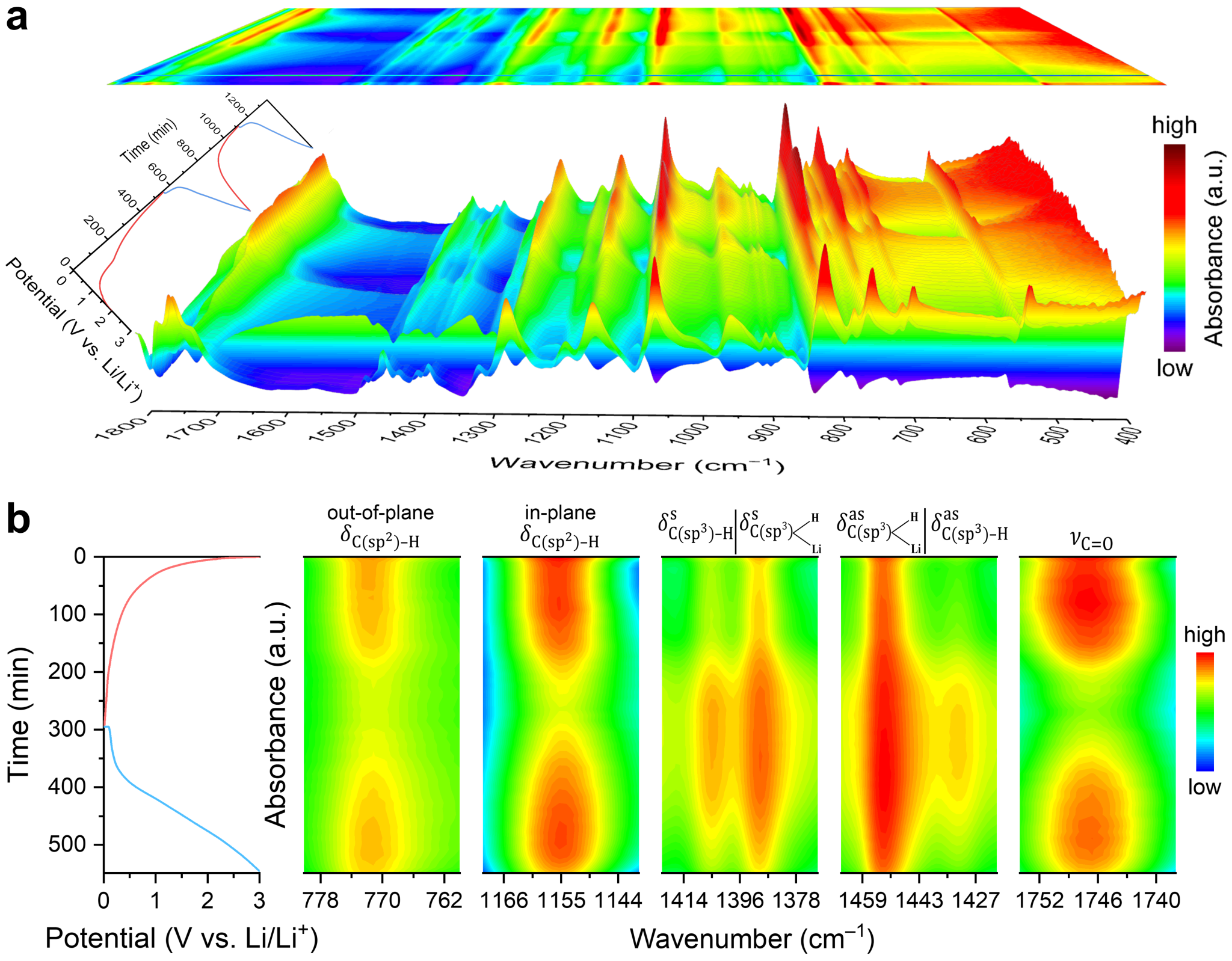 本工作利用离子催化自模板法合成了富氢碳纳米带(HCNR),实现了高比容量(1144.2 mAh g-1,0.1 A g-1)、优异的倍率性能(471.8 mAh g-1,2.5 A g-1)和循环稳定性能。更为重要的是,作者通过电化学原位红外光谱首次获得了C–H键储锂作用机制的直接实验证据,并明确了碳负极材料斜坡容量的来源,即质子化的芳香族sp2-杂化碳(C(sp2)−H)通过杂化到sp3-C进行储锂。该杂化过程高度可逆且动力学快速,可显著提升负极材料的倍率性能;此外,其相对较高的反应电位(0.1~1.0 V)可有效避免锂沉积、解决安全问题。