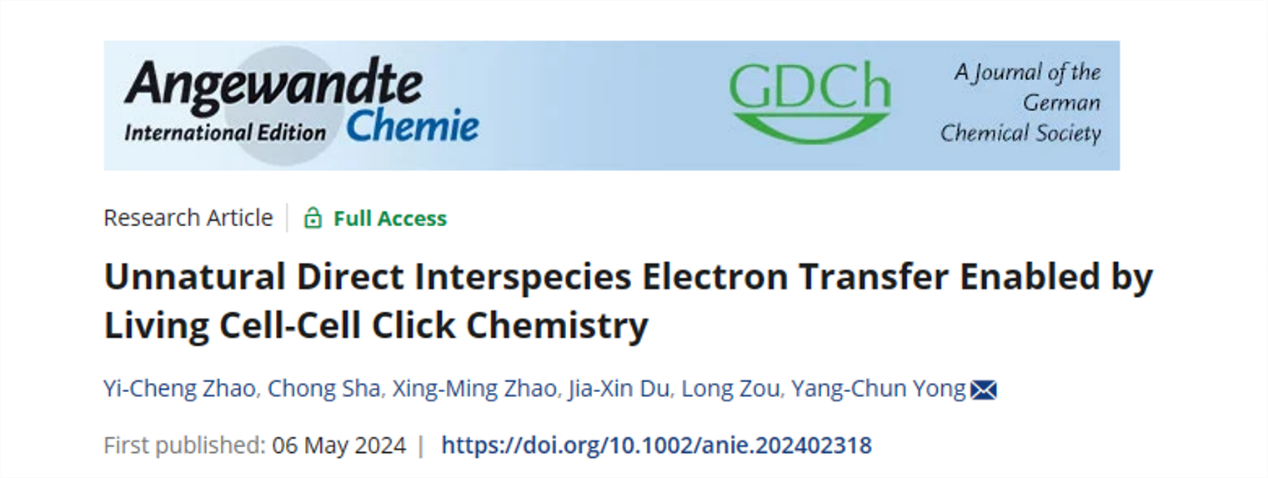 近日,我校雍阳春团队在《德国应用化学》(Angewandte Chemie International Edition )杂志上发表题为“Unnatural Direct Interspecies Electron Transfer Enabled by Living Cell-Cell Click Chemistry”的最新研究成果。爱游戏官方网为第一完成单位和唯一通讯单位,能源研究院/生物质能源研究院雍阳春为唯一通讯作者,环境与安全工程学院/生物质能源研究院硕士研究生赵逸城、教师沙冲为共同第一作者。