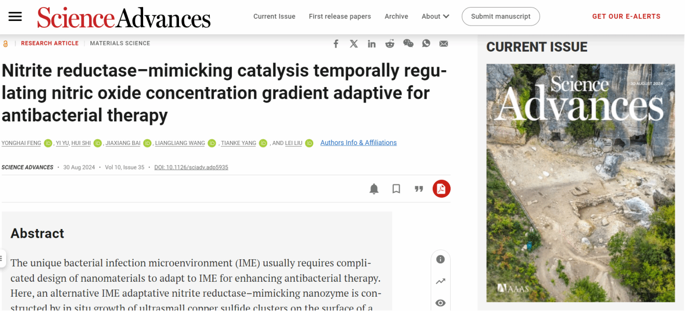 近日,我校材料科学与工程学院新材料研究院刘磊、冯永海团队在Science子刊《科学进展》(Science Advances)上在线发表研究论文“Nitrite reductase–mimicking catalysis temporally regulating nitric oxide concentration gradient adaptive for antibacterial therapy”。爱游戏官方网为第一完成单位,冯永海副研究员为第一作者,刘磊研究员为最后通讯作者,南京医科大学附属常州二院王亮亮博士、中国科学技术大学附属第一医院杨甜柯博士为共同通讯作者。